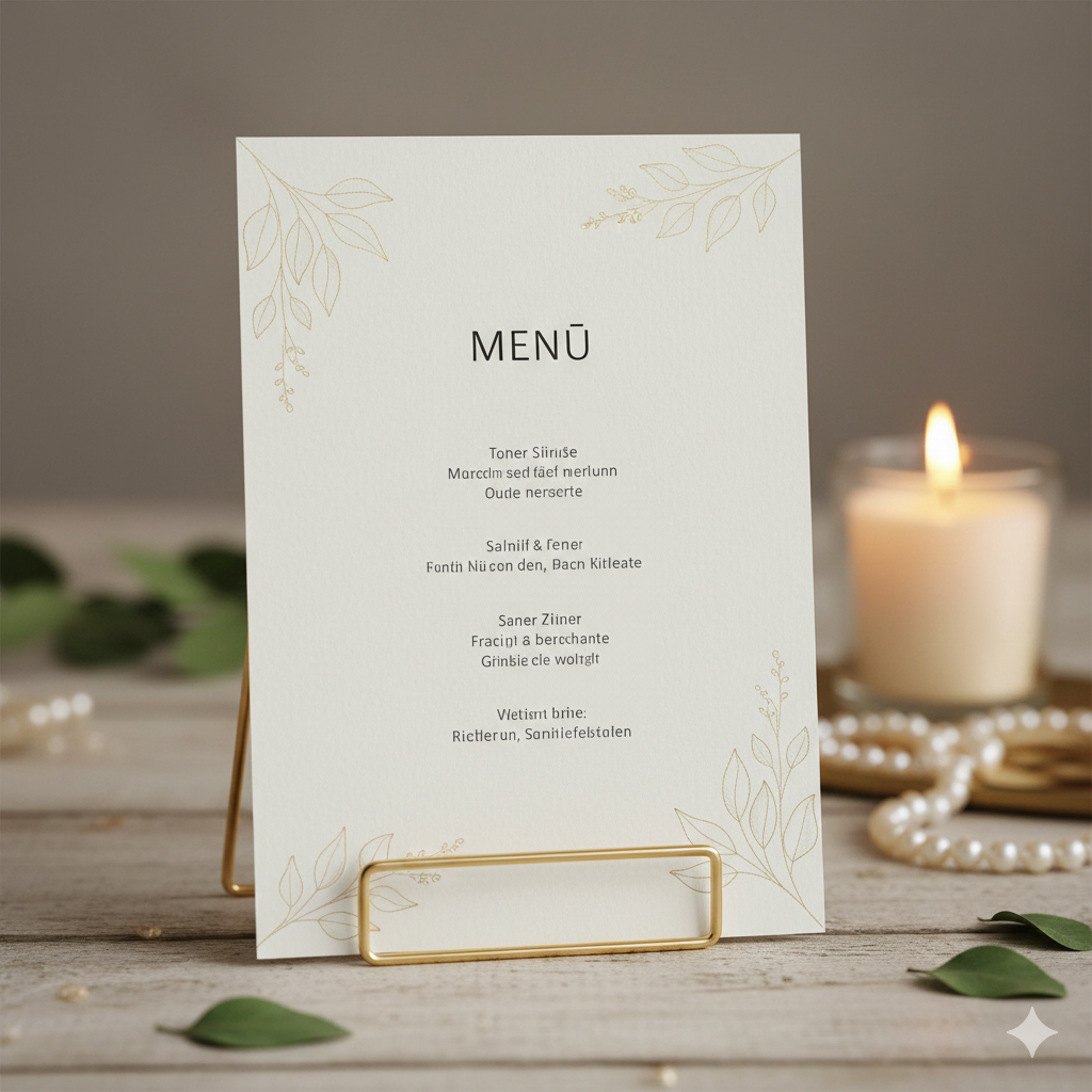 Verleihen Sie Ihrem Hochzeitstisch eine zusätzliche Note von Eleganz mit unserer personalisierten Menükarte "Golden Leaf Elegance". Dieses Design besticht durch zarte, goldfarbene Blattranken, die sich harmonisch um Ihr individuelles Menü schmiegen. Gedruckt auf hochwertigem, cremfarbenem Papier, bietet diese Karte eine luxuriöse Haptik und eine ansprechende Optik.